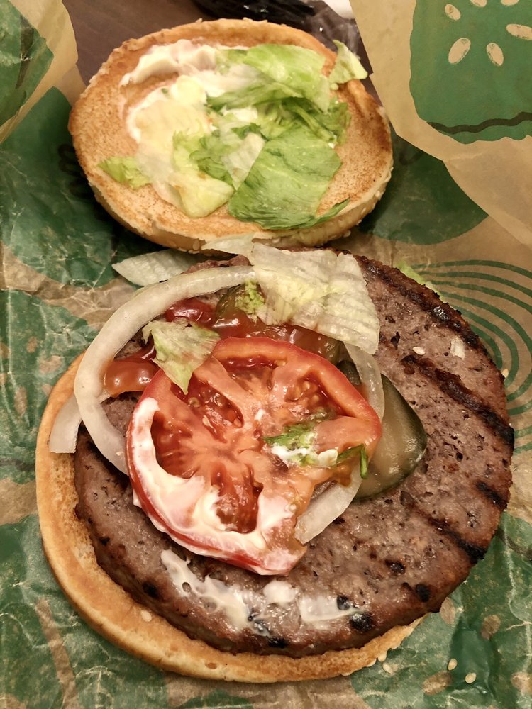 A flame-grilled, plant-based patty with juicy tomatoes, crisp lettuce, creamy mayonnaise, ketchup, crunchy pickles, and sliced white onions on a toasted sesame seed bun. *Patty cooked on the same broiler as beef patties.
