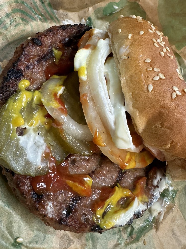 Two flame-grilled pattiesfor a 1/4 lb* of beefwith melted American cheese, crunchy pickles, yellow mustard, and ketchup on a toasted sesame seed bun. *Weight based on pre-cooked patty.